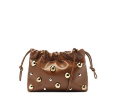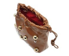 Bolsa tiracolo Rocker média, na cor marrom. O modelo de material similar ao couro tem formato retangular e shape trendy e soft, com acabamento acetinado. Traz alça longa em tira fina e aplicação de maxi studs em ouro e níquel, na capa frontal. Possui fecho superior estilo saco - tipo enforcador - com detalhe em nozinhos nas extremidades, com forro especial vermelho na parte interna da bolsa.