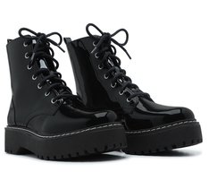 Bota coturno tratorada, em verniz, na cor preta. O modelo de cano curto possui salto baixo e biqueira arredondada. De material similar ao couro com acabamento envernizado, apresenta solado flatform e base emborrachada tratorada - bipartida e com ranhuras - além de contorno superior em costura pesponto contrastante, por todo o cabedal. Com nova construção, o modelo traz fecho por amarração na lingueta e puxador em tira no calcanhar, facilitando o calce.