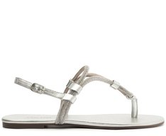 Rasteira slim com manta glam, na cor prata. O modelo possui solado rasteiro emborrachado com leve saltinho traseiro e biqueira arredondada. Traz cabedal com tira central dupla brilhosa em manta glam, que faz arremate em nó nas tiras duplas entre os dedos, conectada no peito do pé, presa pelas laterais e contorna o tornozelo. Detalhe para aplicação de adornos metálicos que prendem as tiras. Traz tira traseira, que contorna o calcanhar, com fecho afivelado ajustável na lateral. Com palmilha acolchoada do mesmo tom da sandália e assinatura Anacapri.