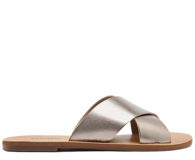 Rasteira Tiras Cruzadas Prata Velho. Rasteirinha de couro Prata com duas tiras grossas na gáspea que se cruzam entre si. Palmilha nude com o nome da marca. Deixa dedos e calcanhar à mostra. Nesse modelo aconselhamos a compra de um tamanho maior do que sua numeração convencional.
