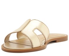 Rasteira New com tira em H, na cor dourada. A rasteirinha, que lembra um slider, apresenta cabedal em tiras geométricas vazadas: duas tiras largas em material similar ao couro, com design de recortes em H sobre a gáspea. Aberta, de biqueira redonda, traz palmilha comfy elevada, com contorno em pespontos e assinatura Anacapri. Traz solado emborrachado nude com leve saltinho traseiro. O modelo deixa os dedos e calcanhar totalmente à mostra.