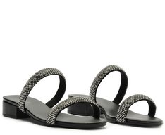 Sandália Mule Salto Bloco Glam Preta. O modelo apresenta cabedal em material similar ao couro com efeito glam. De salto em bloco baixo e biqueira moderna arredondada, traz duas tiras médias com aplicação de manta suede com pedrarias - uma sobre os dedos e outra sobre o peito de pé. Aberta atrás, traz palmilha acolchoada de mesmo tom da sandália com assinatura Anacapri.