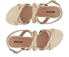 Sandália de salto bloco em tiras com multi tachas, na cor dourada. O modelo apresenta cabedal com design moderno com tiras médias cruzadas - sobre os dedos e sobre o peito de pé - com detalhe para aplicação de multi tachas metálicas. De biqueira arredondada e salto em bloco baixo, traz palmilha nude e assinatura Anacapri. Possui tira que contorna do calcanhar, com fecho em fivela lateral ajustável.