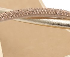 Sandália de salto bloco com tira glam entrelaçada, na cor dourada. O modelo apresenta cabedal em material similar ao couro, com efeito glam. De salto em bloco baixo e biqueira moderna arredondada, traz tiras duplas sobre os dedos, uma tira sobre o peito de pé e duas tiras centrais que se entrelaçam - sendo uma delas em manta suede aplicação de pedrarias. Aberta atrás, traz palmilha acolchoada de mesmo tom da sandália, com assinatura Anacapri.