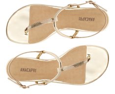 Sandália de salto bloco com tiras slim na cor dourada. O modelo de material similar ao couro com efeito metalizado e envernizado traz biqueira arredondada. De salto em bloco baixo, possui cabedal com tira fina que passa entre os dedos, conectada a mais uma tira fina no peito do pé. Apresenta ainda tira fina no calcanhar com fecho em fivela metálica lateral. A sandália tem palmilha lisa bege com assinatura Anacapri.