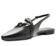 Sapatilha slingback em verniz de duas tiras, na cor preta. O modelo de bico fino possui solado rasteiro emborrachado, com leve saltinho traseiro. Feita em material similar ao couro com acabamento envernizado, traz fecho estilo slingback em fivela lateral, por tirinha que contorna o calcanhar. Com design imponente de recortes no cabedal, traz aplicação de duas tirinhas afiveladas laterais, sobre o peito de pé. Com palmilha nude e assinatura Anacapri.