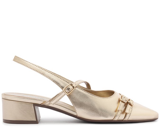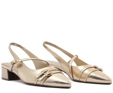 Sapatilha slingback de salto bloco, com detalhe em fivelas, na cor dourada. O modelo de bico fino possui salto em bloco baixo. Feita em material similar ao couro com acabamento envernizado, traz fecho estilo slingback, por tira elástica que contorna o calcanhar. Com design imponente de recortes no cabedal, traz aplicação de duas tirinhas afiveladas laterais - sobre a gáspea - e outra tirinha afivelada na transversal do peito de pé, com detalhe em costura pespontada e delicada no contorno das tiras. Com palmilha comfy no mesmo tom da sapatilha e assinatura Anacapri.