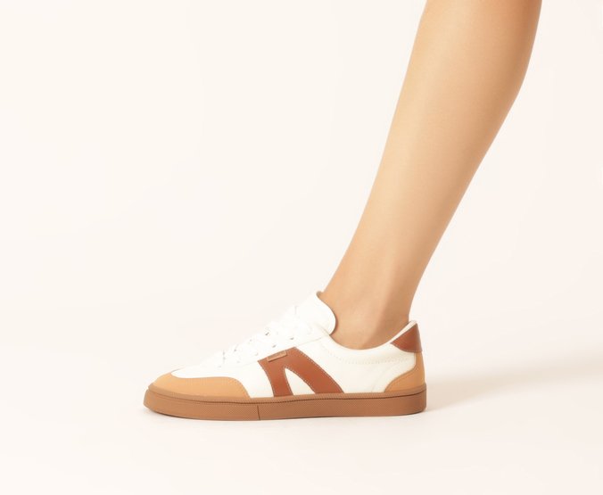 Tênis Belize com detalhes em marrom. De solado baixo emborrachado em goma marrom vulcanizada, o modelo apresenta cabedal com detalhe de costura pesponto nas laterais e contornos, com design de recortes na biqueira, na parte traseira e na lingueta, em mix de materiais em napa e camurça, nos tons de marrom. De amarrar, com atacadores brancos, possui parte interna forrada. Com aplicação de peça recortada com design em “A” em napa marrom e tag lateral marrom Anacapri.