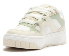 Tênis Ivy maxi nos tons de branco e verde. O modelo apresenta nova construção no solado - mais alto e estruturado, traz sola flatform emborrachada e tratorada nude, com detalhe lateral. Com um design maxi e imponente, o tênis apresenta aplicação de peças recortadas por todo o cabedal nas cores verde e bege, com acabamento pespontado nos contornos e perfuros no tecido, proporcionando maior respirabilidade. De amarrar, com atacadores brancos e lingueta mais robusta, larga e fofa. Aplicação de puxador traseiro em fita de gorgurão, facilitando o calce e tag marrom lateral, com assinatura Anacapri .